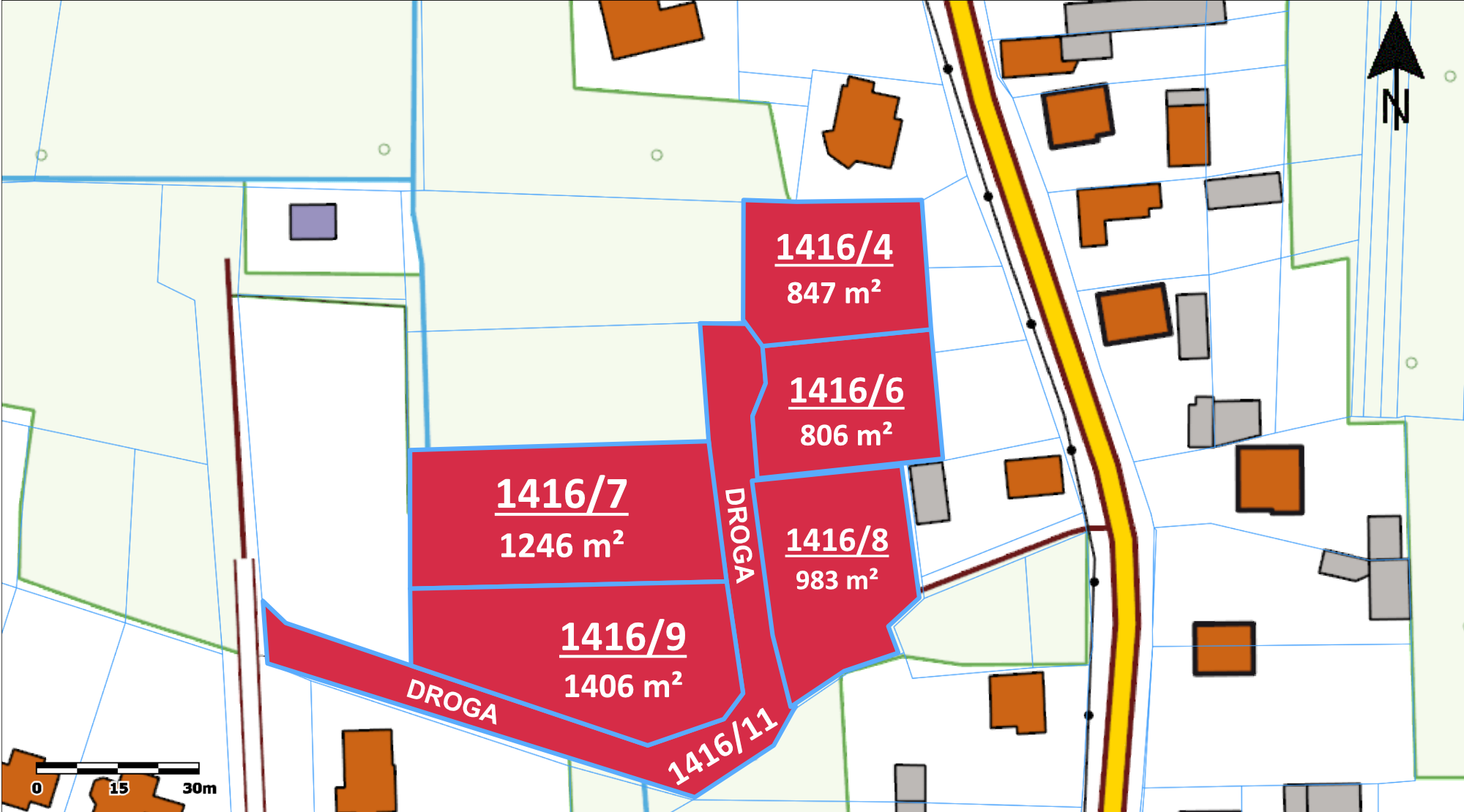 Sprzedażą objęte jest prawo własności działek o numerach ewidencyjnych nr 1416/4; 1416/6; 1416/7; 1416/8; 1416/9, ujawnione w księdze wieczystej nr KA1B/00064855/7 wraz z udziałem w prawie własności działki nr 1416/11 stanowiącej wewnętrzną drogę dojazdową, ujawnione w księdze wieczystej nr KA1B/00049521/6