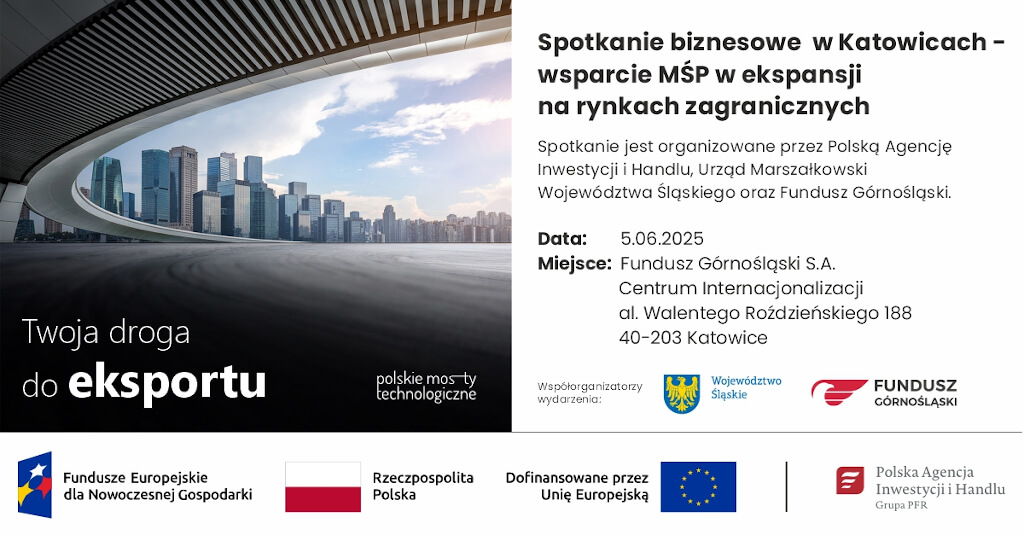 Fundusz Górnośląski oraz Polska Agencja Inwestycji i Handlu (PAIH) zapraszają śląskie firmy na wyjątkowe spotkanie poświęcone rozwojowi działalności eksportowej. To już kolejne wspólne przedsięwzięcie obu instytucji, które łączy doświadczenie, wiedzę i sieć kontaktów, by otwierać przed przedsiębiorcami drzwi do rynków zagranicznych. Spotkanie odbędzie się 5 czerwca w Centrum Internacjonalizacji w godzinach 9:00 – 14:30.