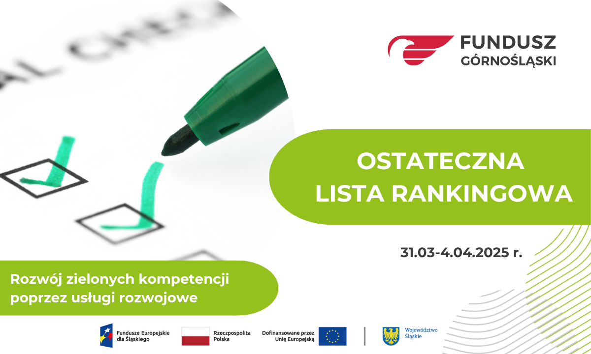 Publikujemy ostateczną listę rankingową fiszek zgłoszeniowych na szkolenia/walidacje/certyfikacje do projektu „Rozwój zielonych kompetencji poprzez usługi rozwojowe” w ramach naboru, który odbył się w terminie 31.03-4.04.2025 r.